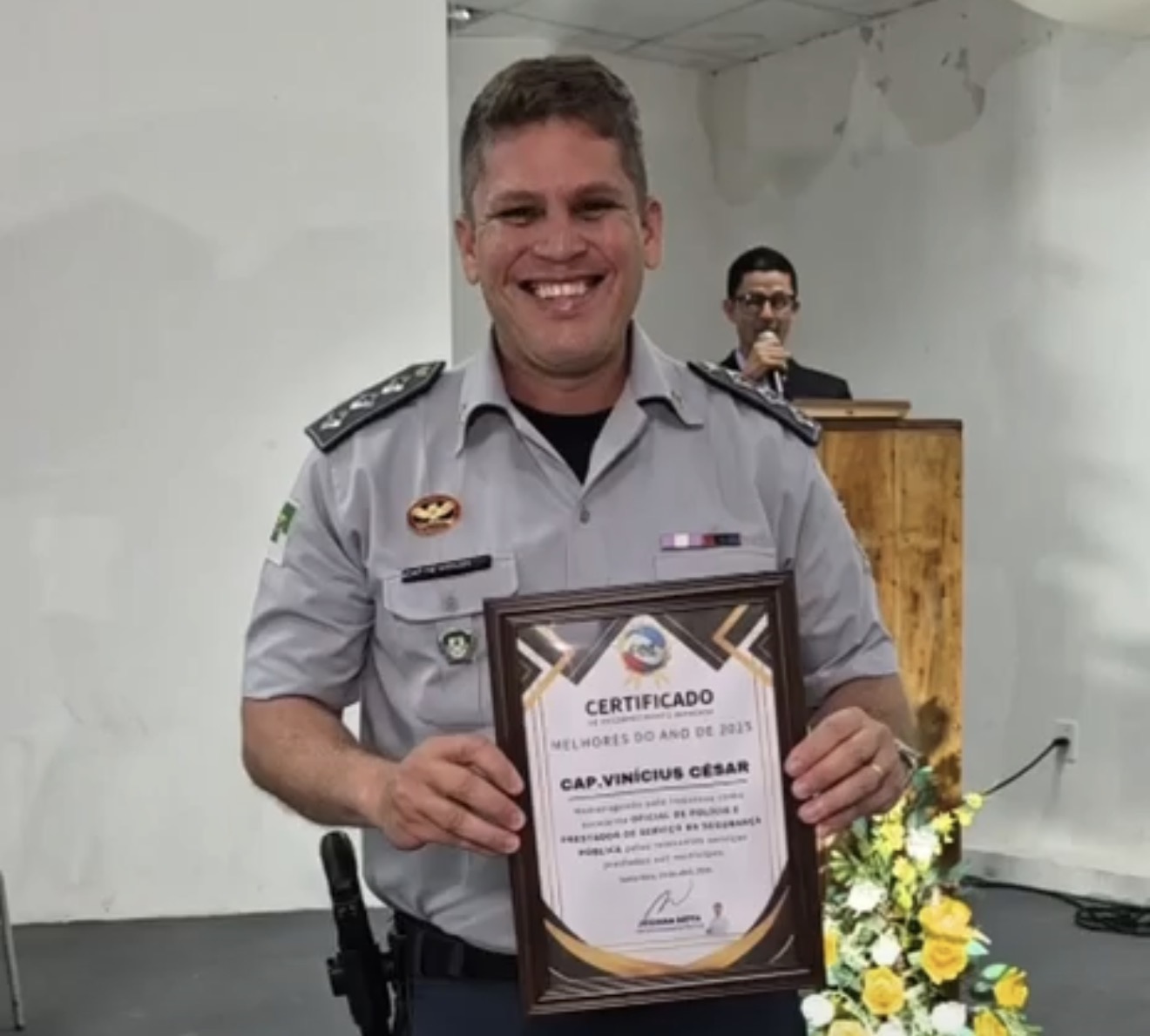 O Capitão Vinícius foi homenageado pela Cine TV em reconhecimento aos relevantes serviços prestados à população de Extremoz. A homenagem destaca a atuação firme e